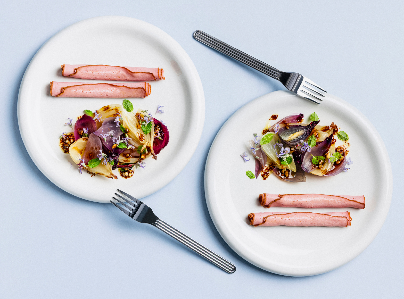 Das Auge isst immer mit, deshalb ist uns die Auswahl des Geschirrs für unsere Neuburger Rezepte immer wichtig. Das Thema der leichten, sonnigen Gerichte setzt sich mit schlichten Tellern und Besteck fort, die den modernen Geschmackskompositionen in Farbe und Form unterstreichen.