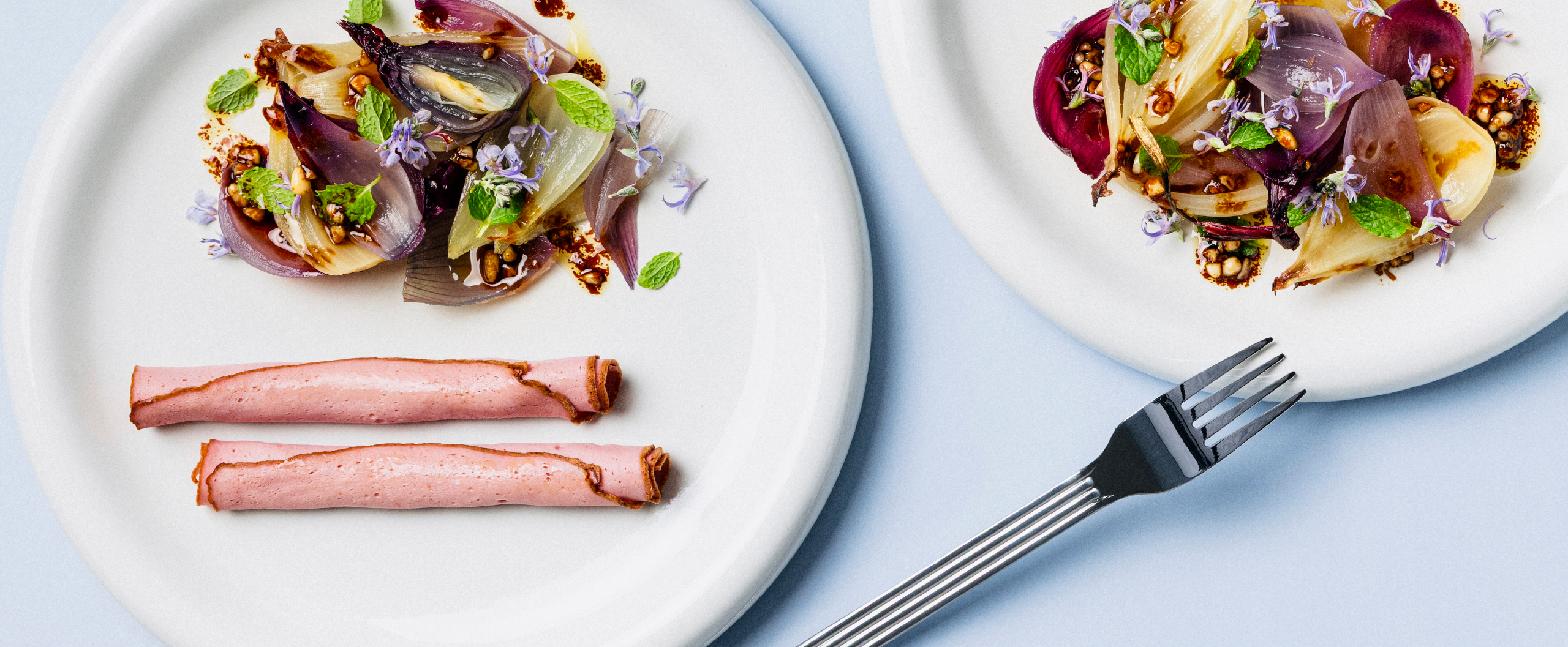 Die Zwiebeln etwas abkühlen lassen, aus der Schale drücken und in Stücke schneiden. Mit dem Dressing begießen, mit Minze garnieren und gemeinsam mit dem Neuburger servieren.